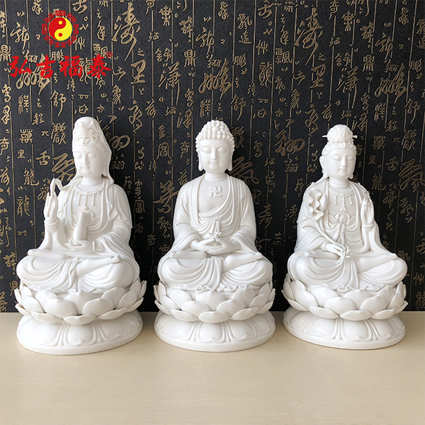 西方三圣是信佛居士最常见供奉的佛和菩萨。中间的是阿弥陀佛,东边是观世音菩萨,西边是大势至菩萨。阿弥陀佛代表无量光明、无量寿命、无量功德,观世音菩萨代表宇宙的大慈悲。大势至披萨代表喜舍。