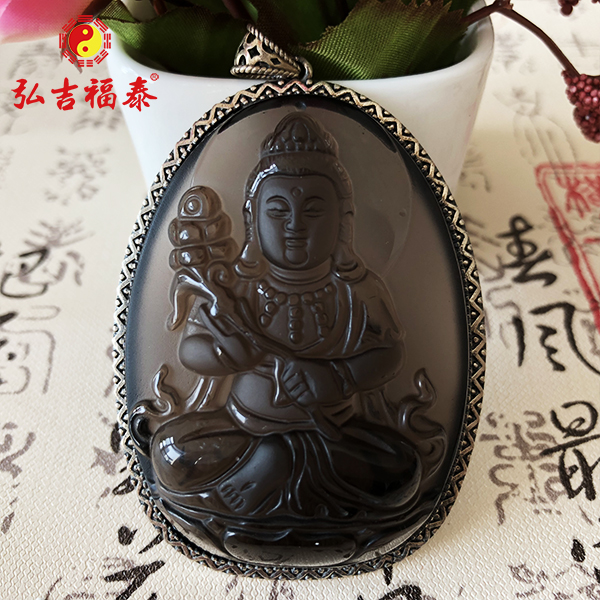 冰种黑曜石大势至菩萨吊坠(镶银)
